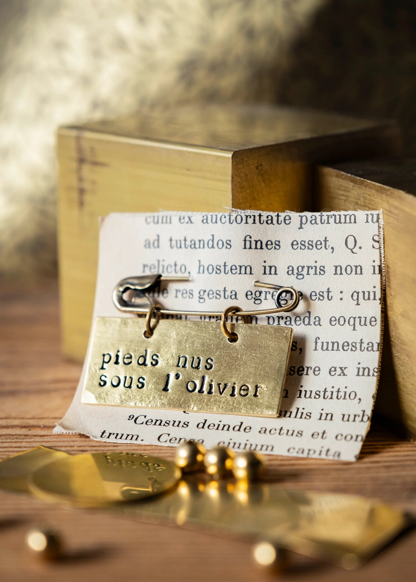 Réalisées en laiton, ces broches sont entièrement façonnées à la main. Le métal est découpé puis martelé, avant que chaque lettre ne soit poinçonnée une à une. Le rythme du geste, patient et précis, donne naissance à un mot ou à une courte phrase dont le tracé noirci se révèle doucement dans la matière. Le résultat est simple, presque confidentiel : un message visible pour qui prend le temps de regarder.