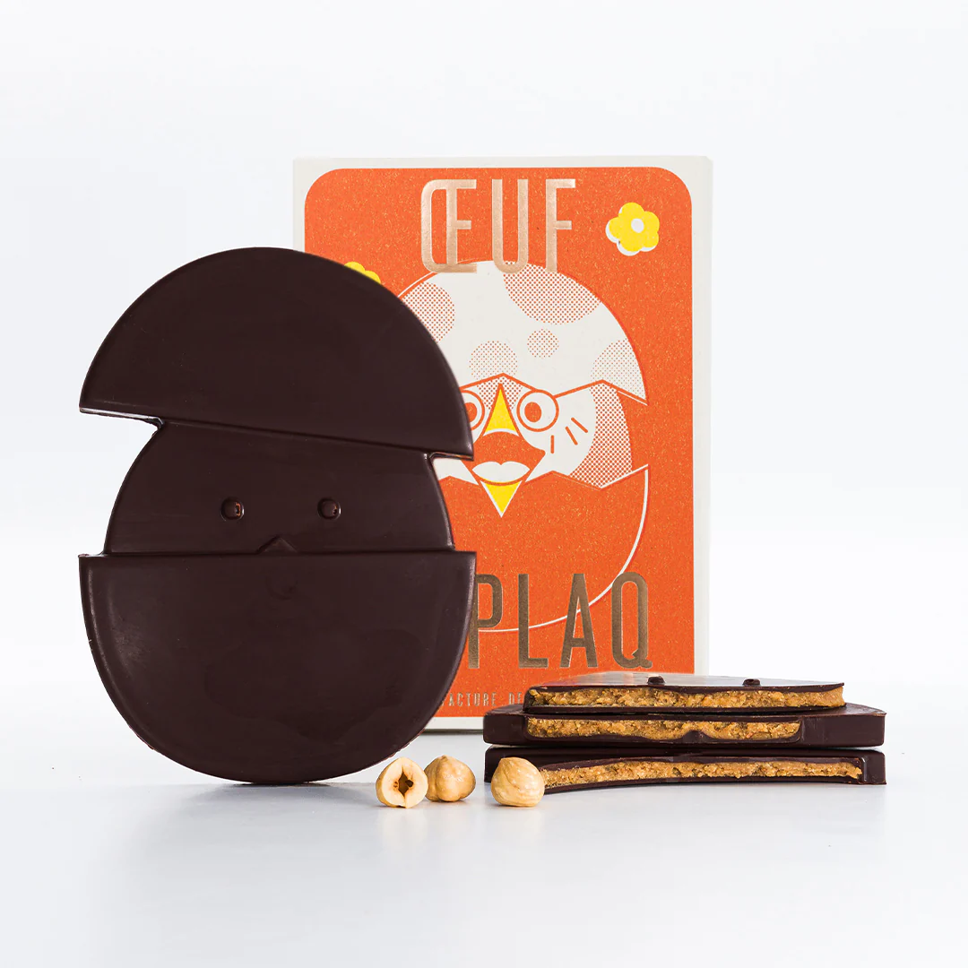 La spécialité de Pâques : Leurs créations minimalistes et graphiques. Contrairement aux moulages très chargés, Plaq propose souvent des sujets aux lignes épurées (comme leur célèbre lapin au design presque architectural) mettant en valeur des crus de cacao rares et des pralinés "bruts" à la texture croquante.